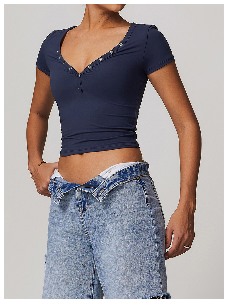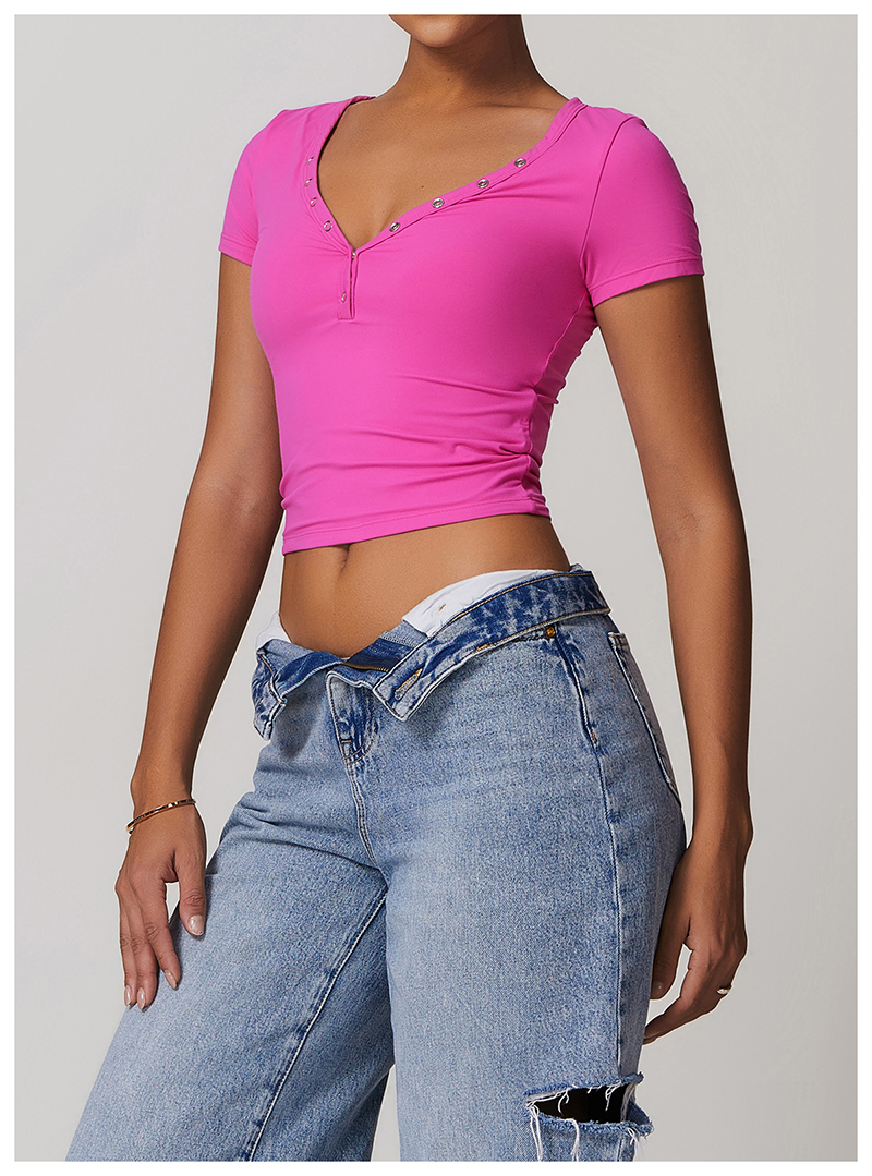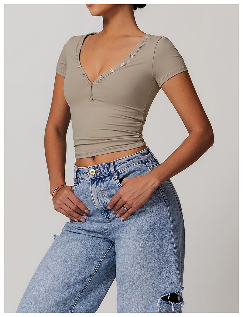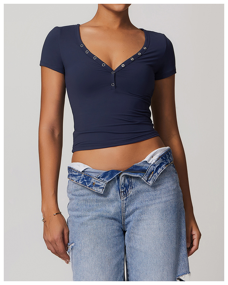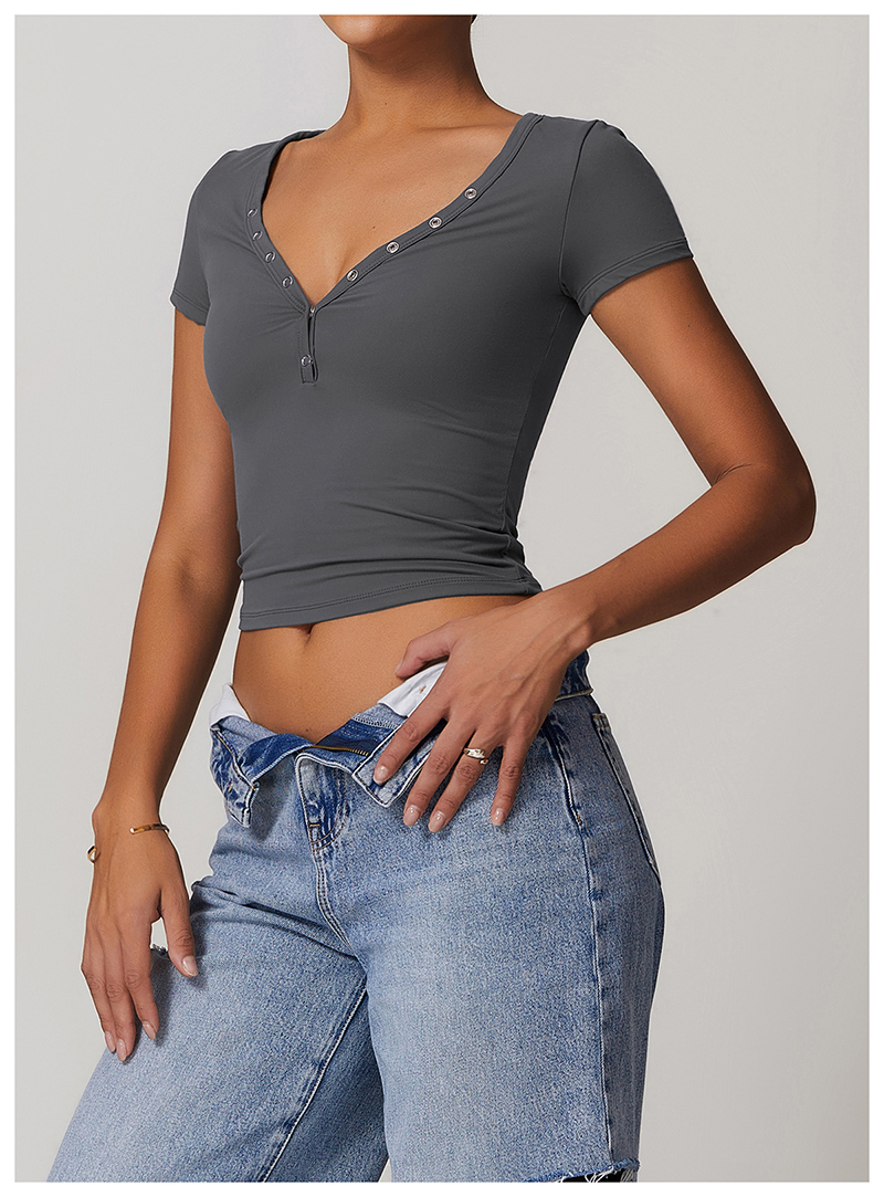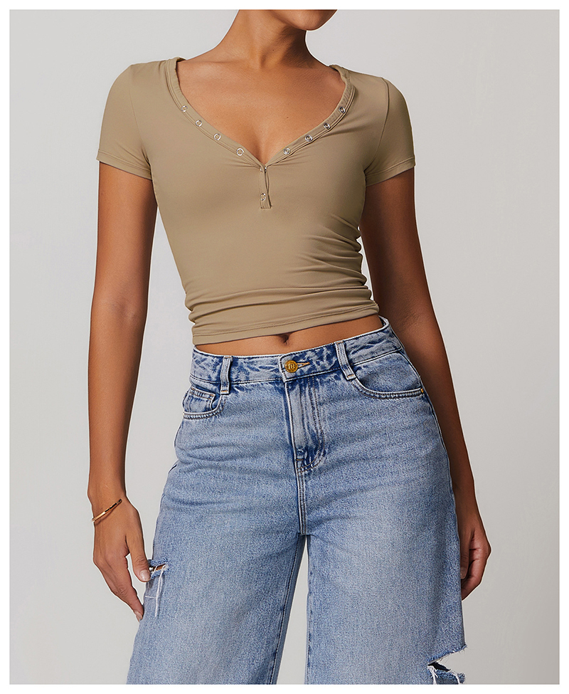 • Milled Tight Breathable Yoga Short Sleeve Women V Neckline Metal Buckle Design Running Sports Breathable Fitness T-shirt Tops
