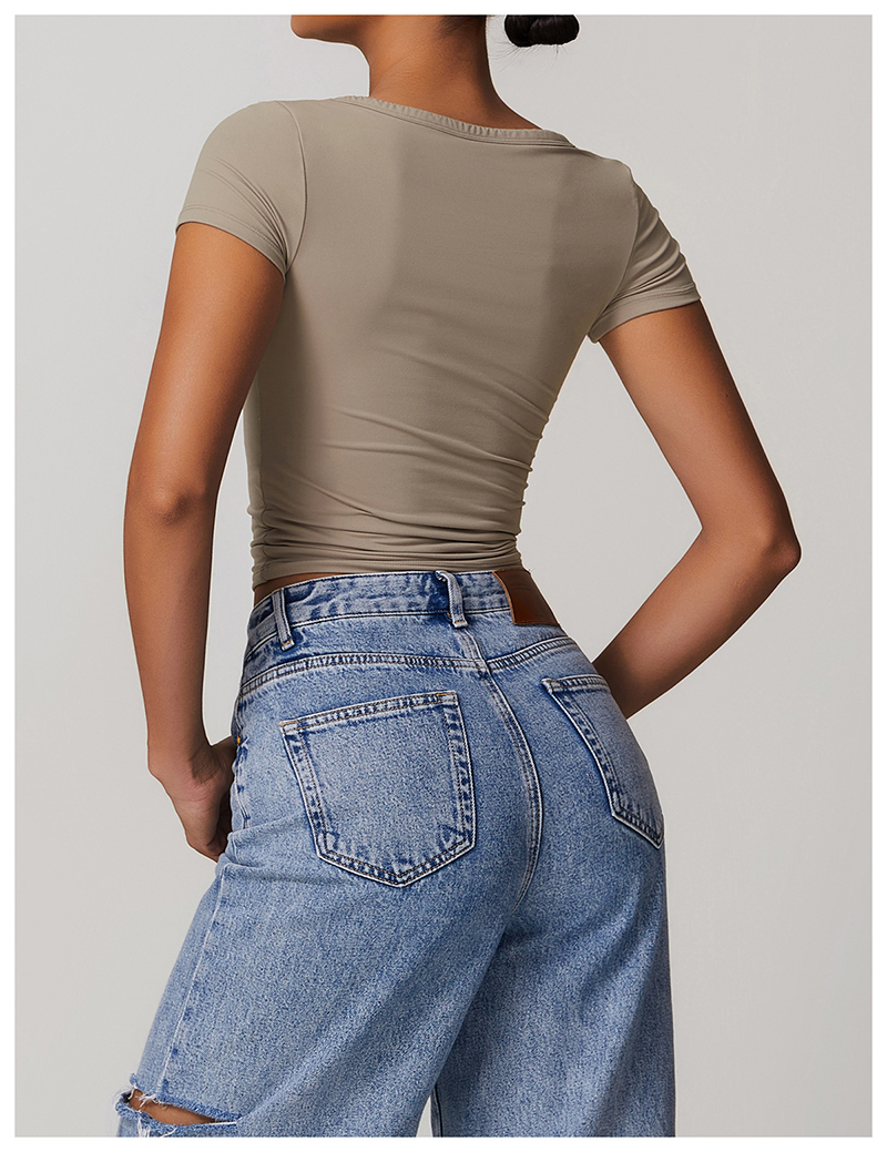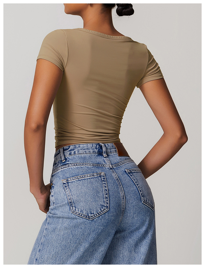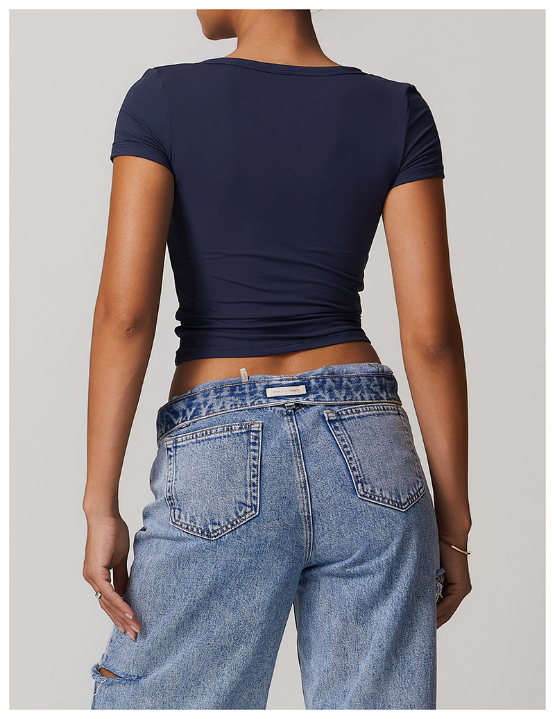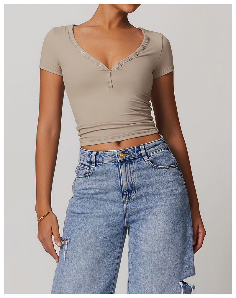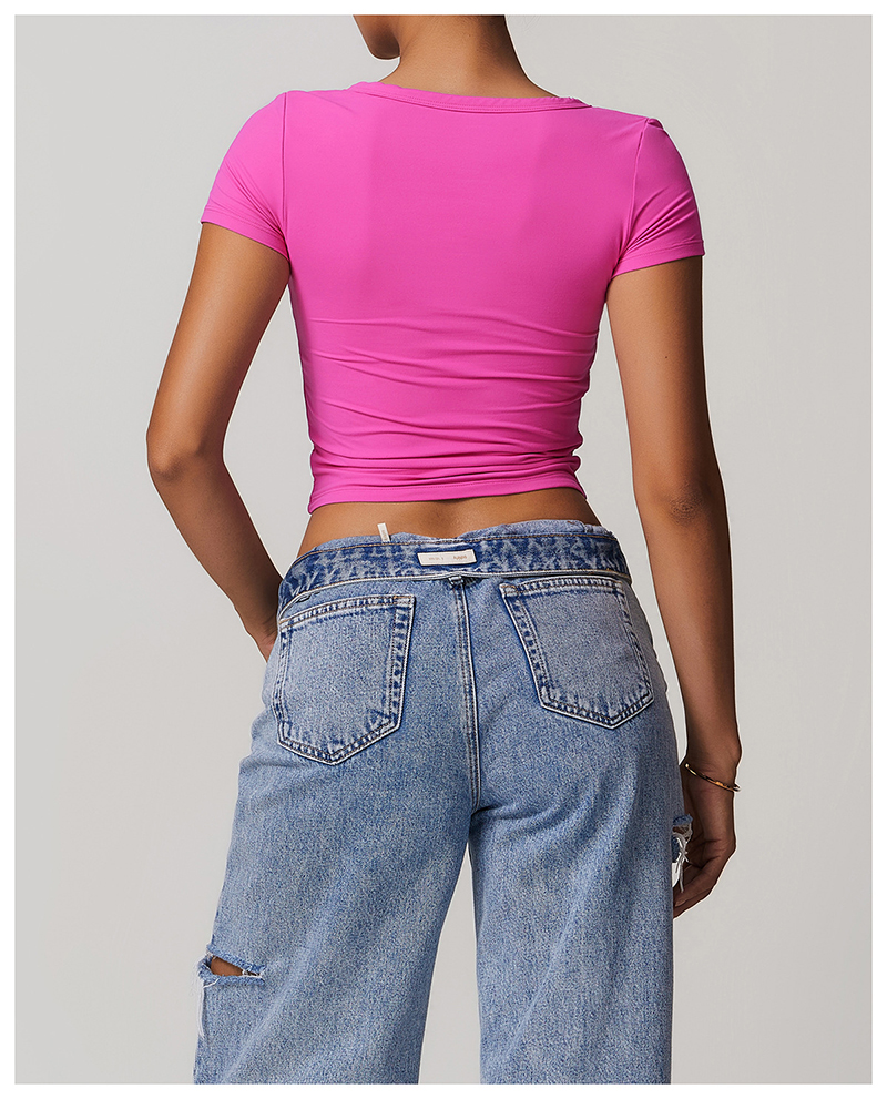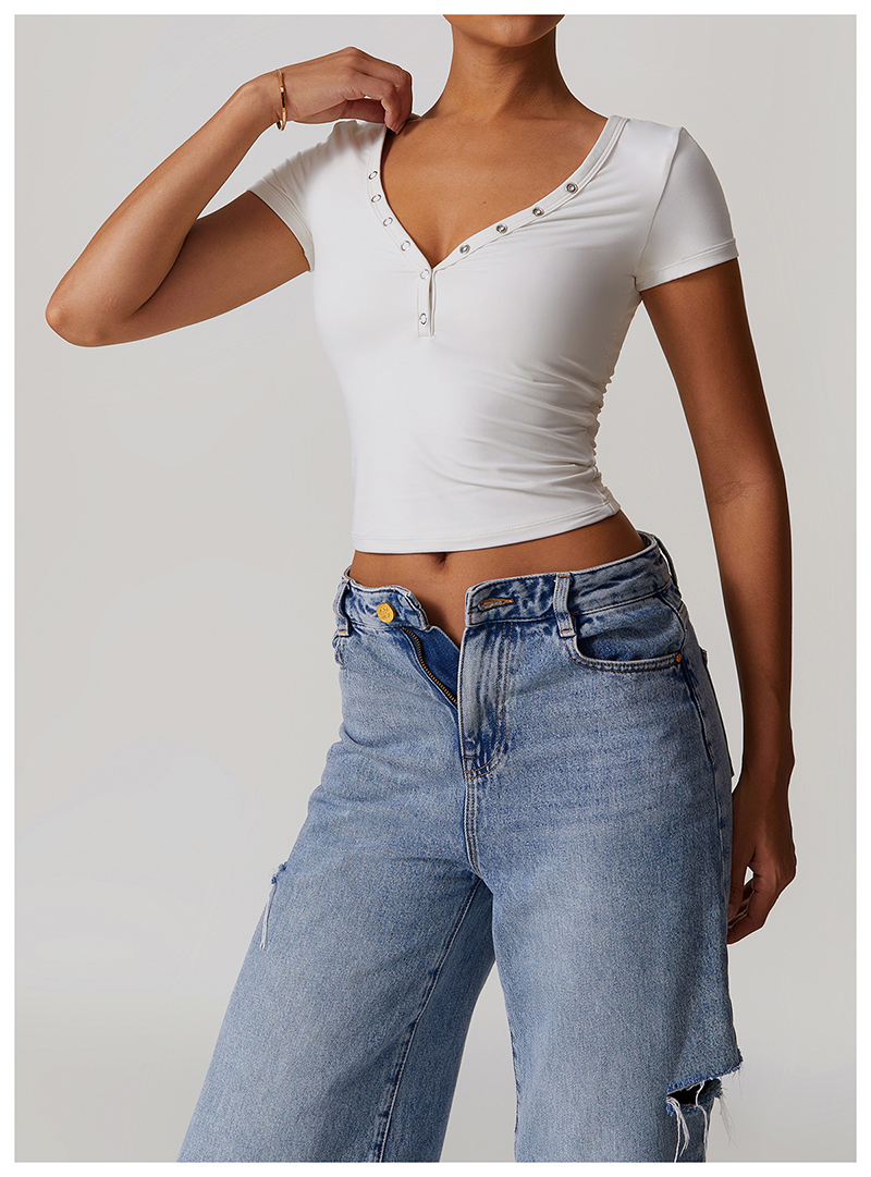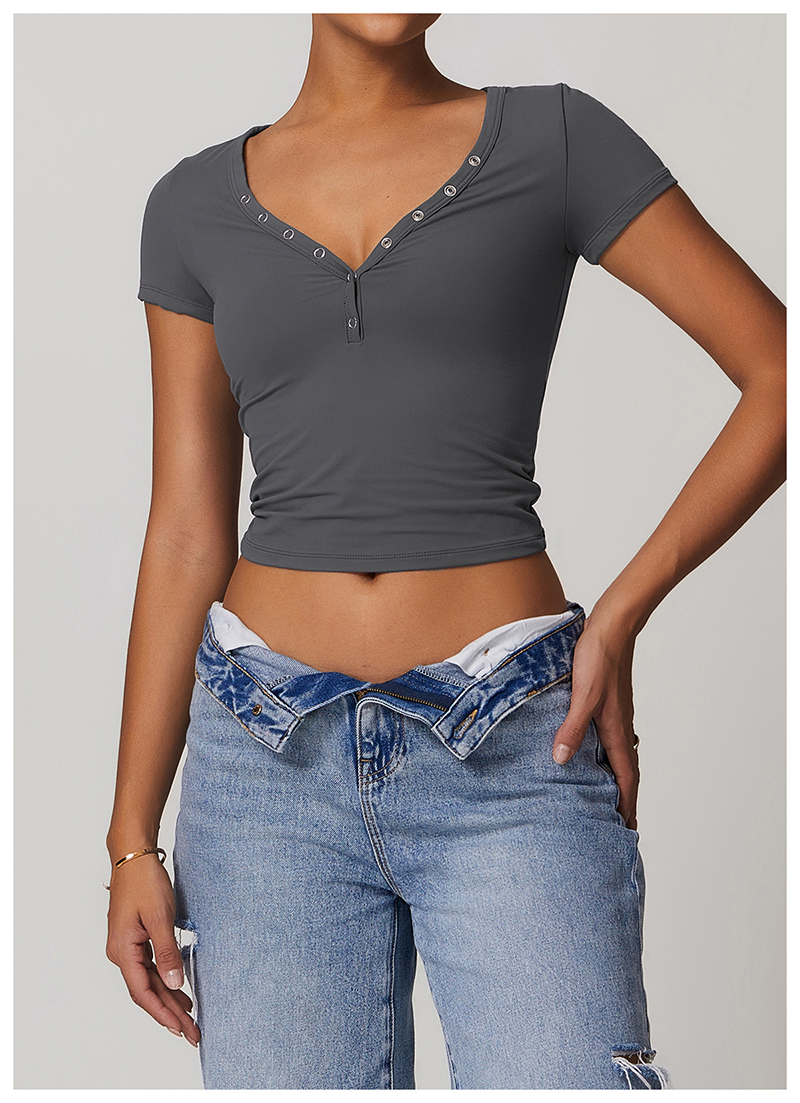 • Milled Tight Breathable Yoga Short Sleeve Women V Neckline Metal Buckle Design Running Sports Breathable Fitness T-shirt Tops
