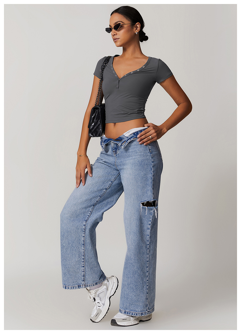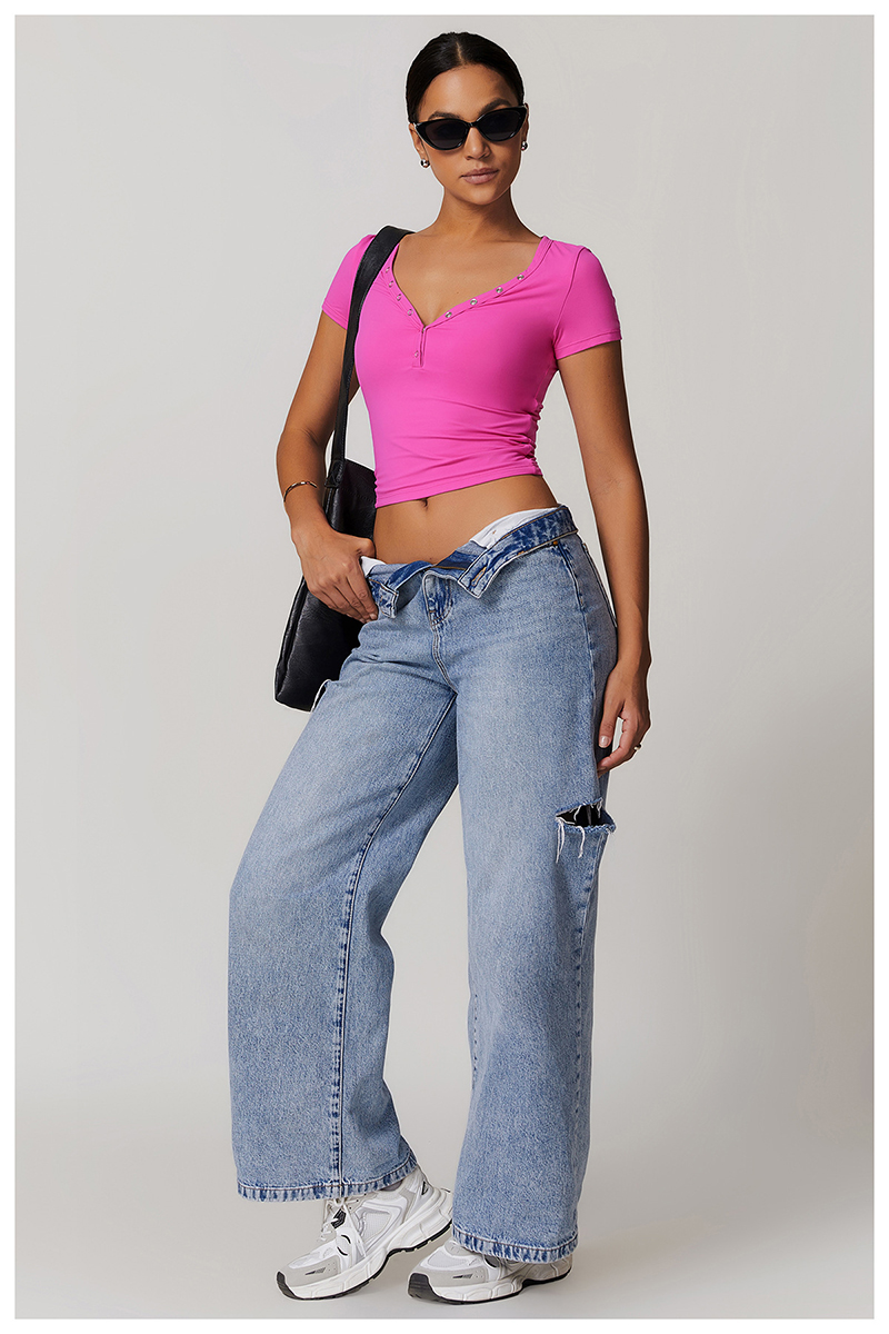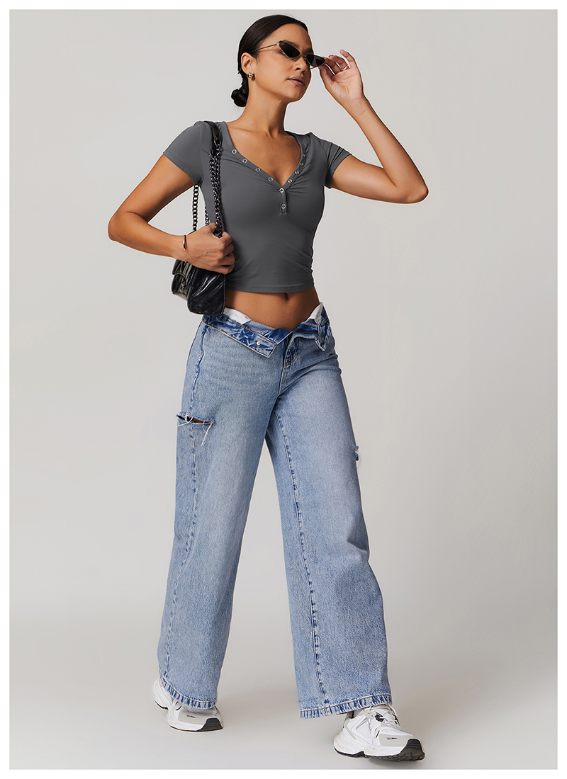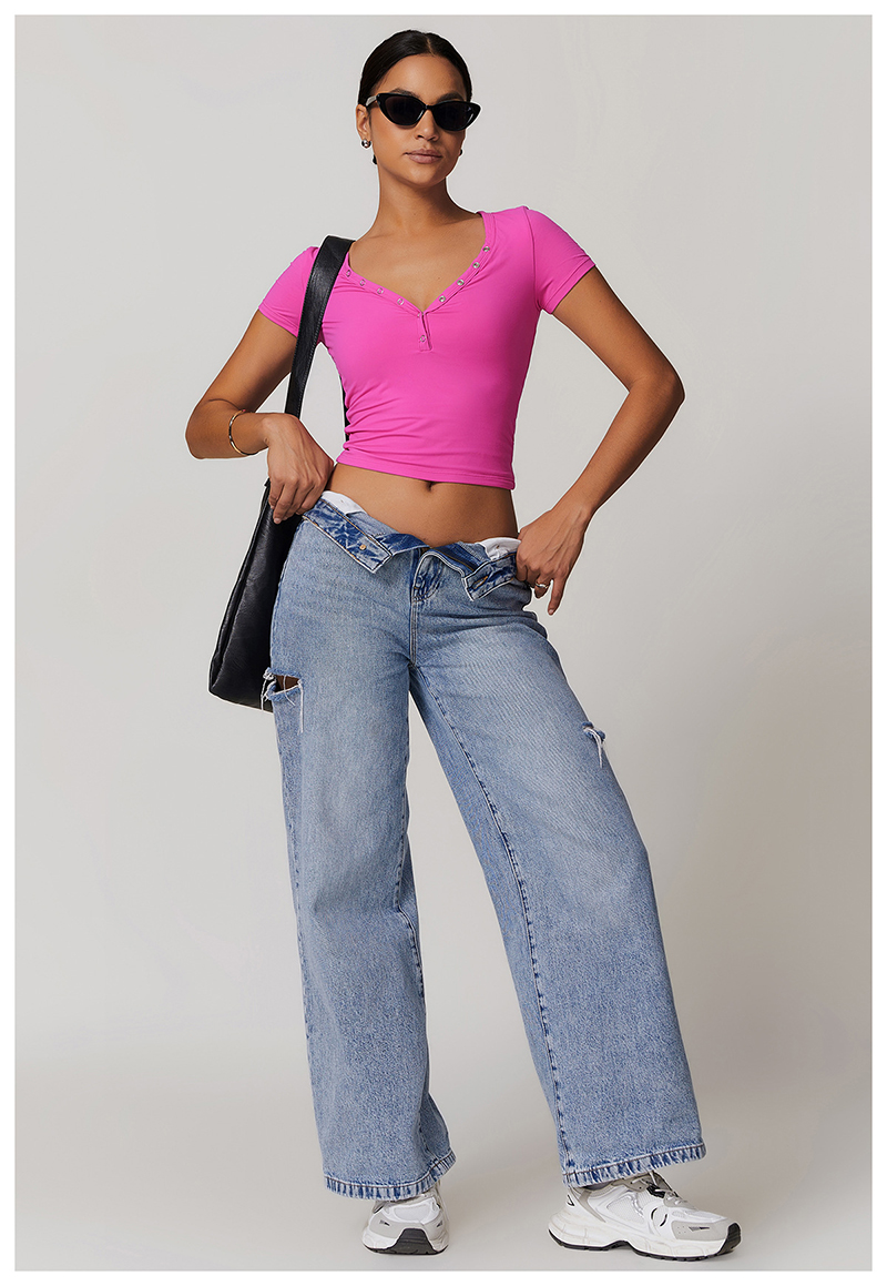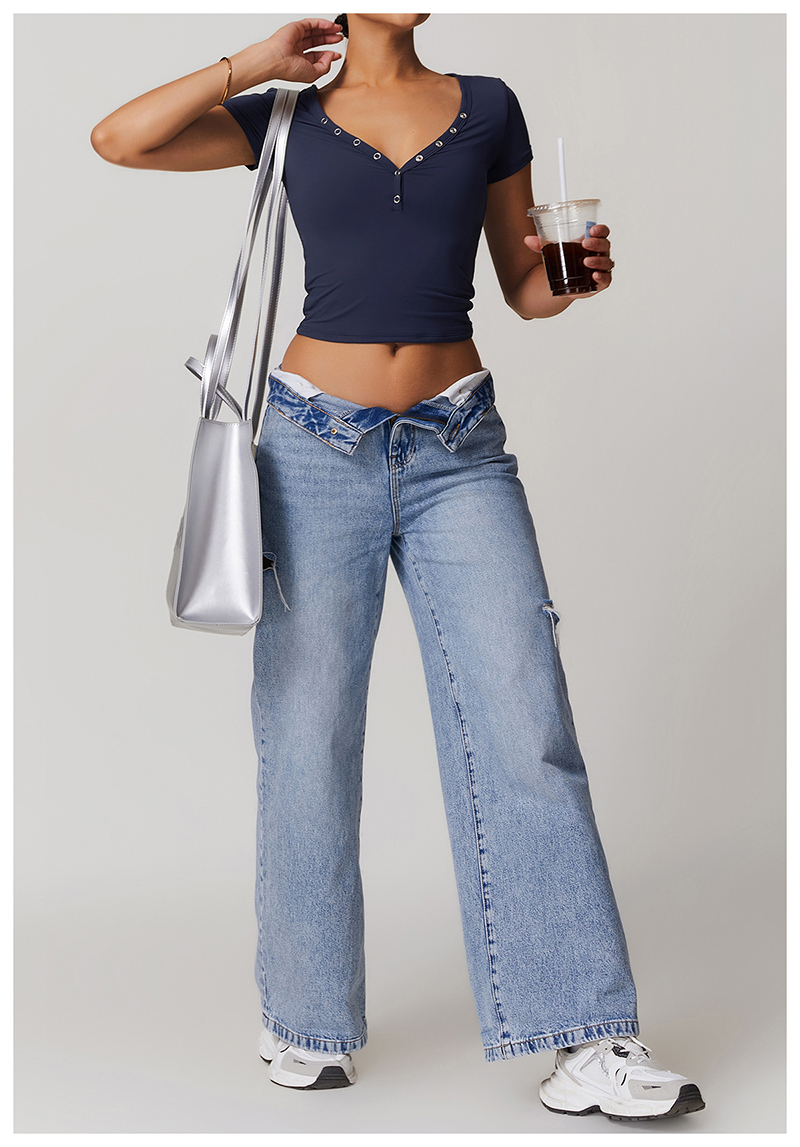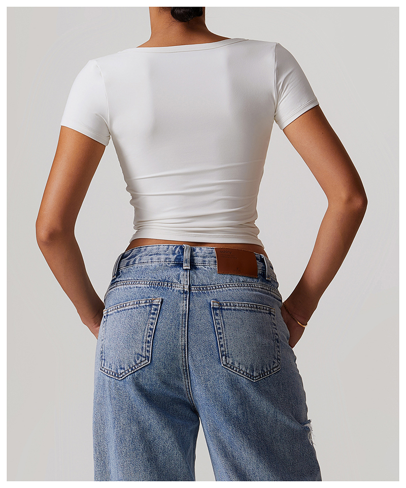 • Milled Tight Breathable Yoga Short Sleeve Women V Neckline Metal Buckle Design Running Sports Breathable Fitness T-shirt Tops