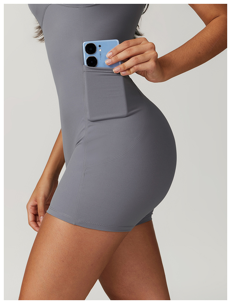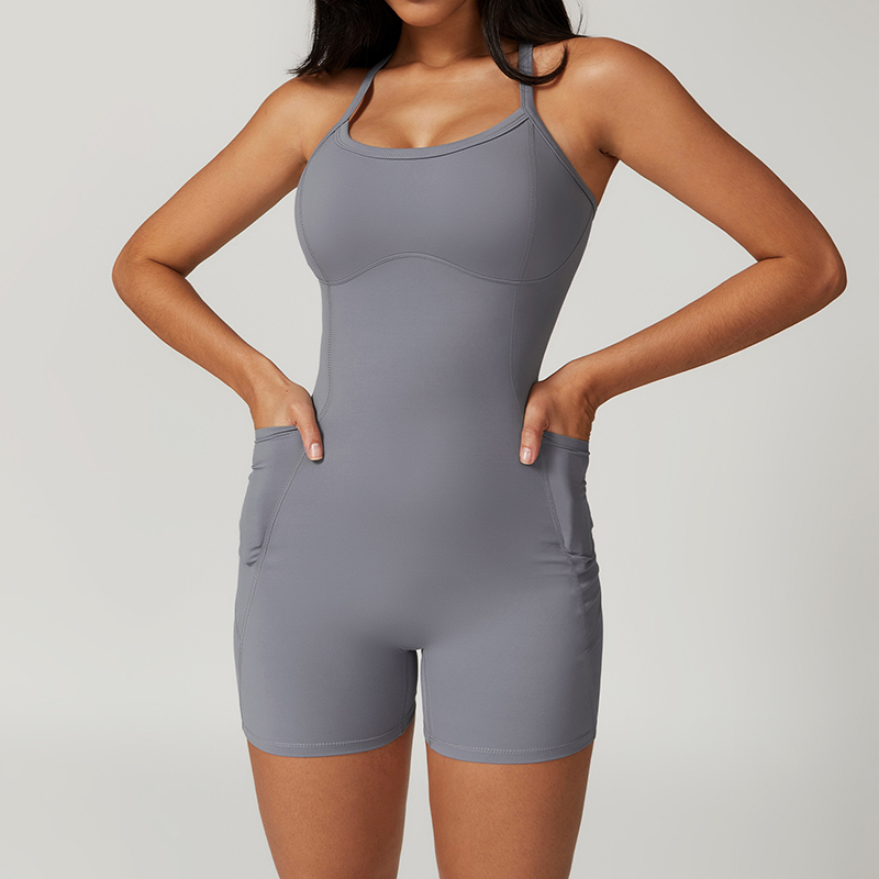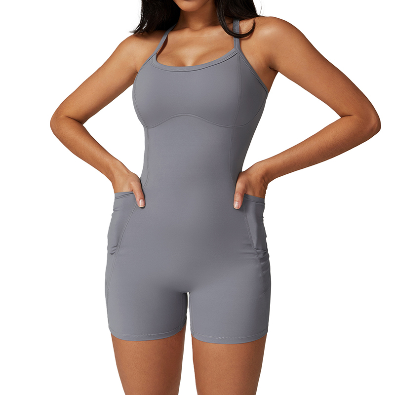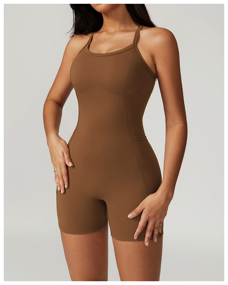 Pockets Casual Tight Body Beautiful Back Yoga Jumpsuit with Chest Pad Quick Dry Breathable Gym Senseless Sports Fitness Clothing